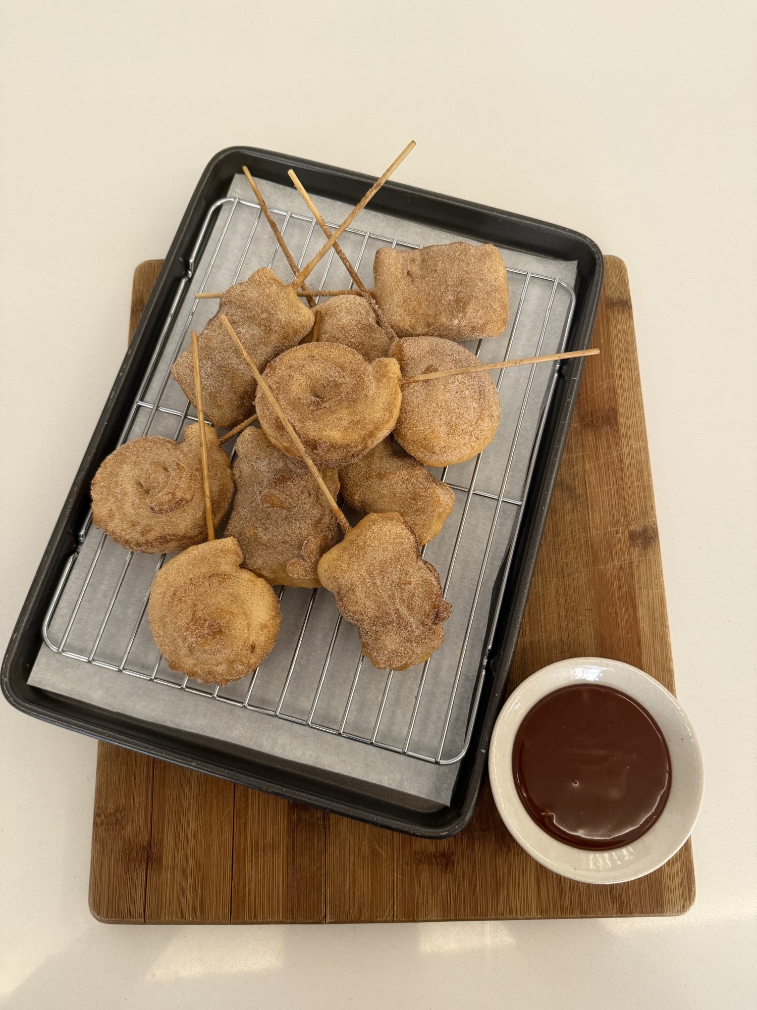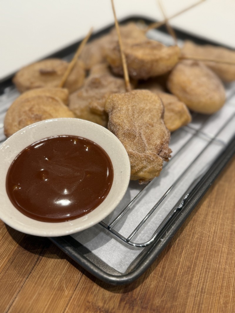 - While holding the end of the skewers, dip the rice cakes into the churros batter, and swirl to ensure it is fully coated, and place them into the oil. Repeat until all of the skewers are dipped, and fry until golden brown and puffy, about 3 to 4 minutes, flipping as necessary. Remove and place on a rack set over a tray, to cool and allow excess oil to drip off.