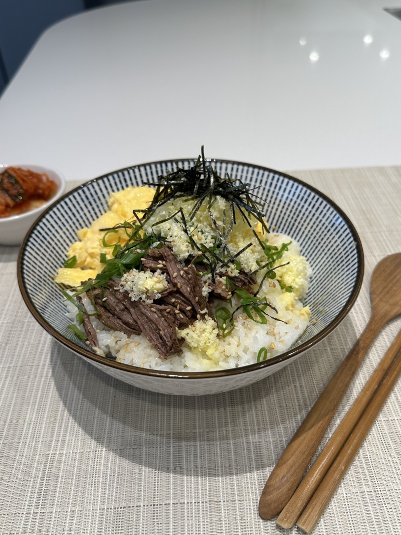 If there’s one dish that knows how to soothe the soul and silence a growling stomach, this is it. Jangjorim Butter Bap—salty soy-braised beef piled over hot, buttery rice and soft pillowy scrambled eggs—is pure Korean comfort with a luxe twist. The jangjorim brings that deep, savory umami while the scrambled eggs add creamy richness, all tied together with a pat of melting butter and a whisper of dashi. Out of all the recipes in this series, this one stole my heart—it’s the kind of dish I could eat on repeat and never tire of. Salty, satisfying, and deceptively simple. Sprinkle on some scallions or seaweed flakes, and just like that, you’ve got a hug in a bowl.