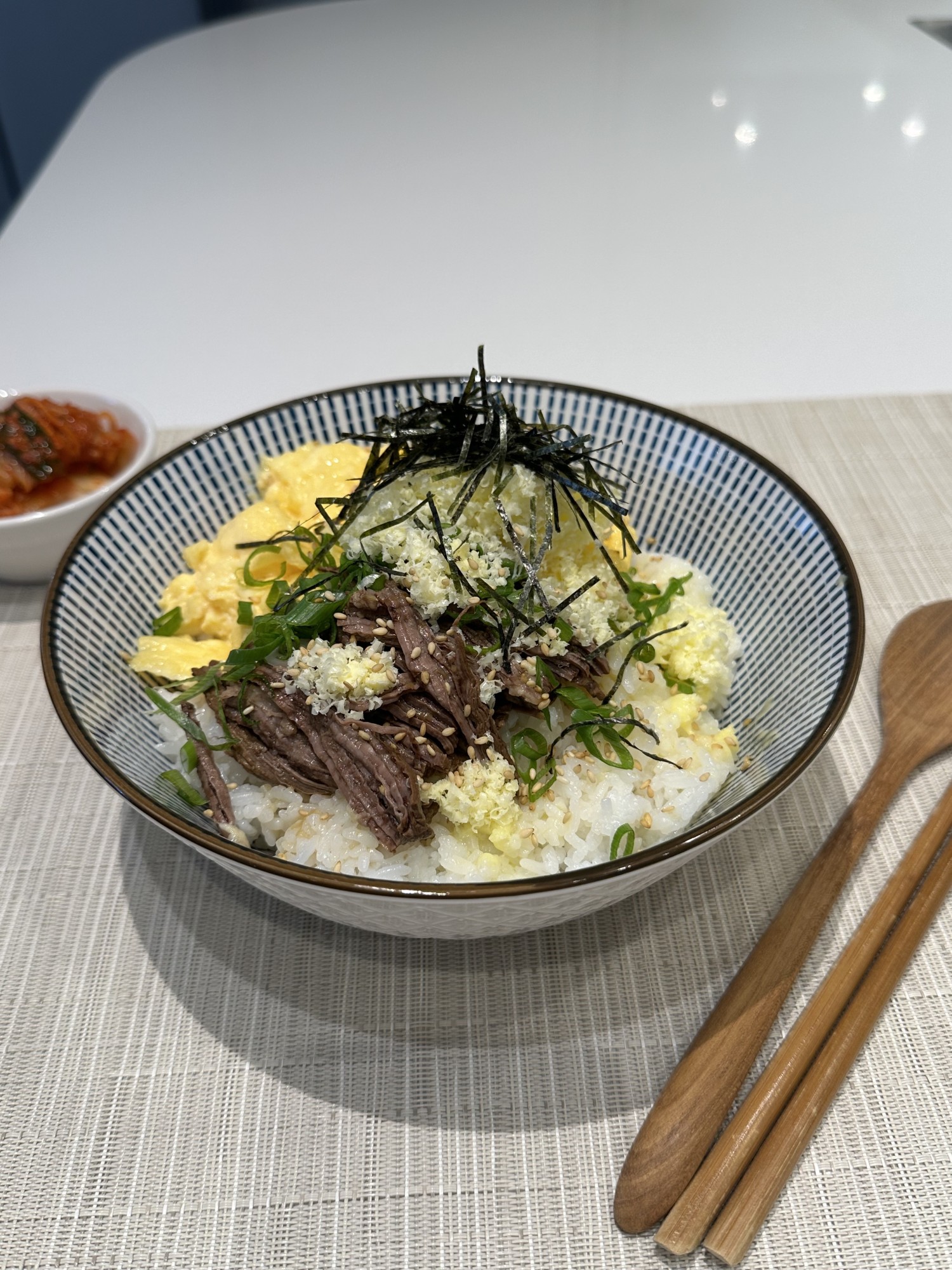 - To serve, scoop some rice into two bowls, spoon over the scrambled eggs evenly. Top with the shredded beef and spoon some sauce generously over the meat and rice. Remove the butter stick from the fridge and grate curls of butter using a microplane to finish. Garnish with scallions, grated butter, and seaweed. Serve immediately with kimchi on the side, if you like.