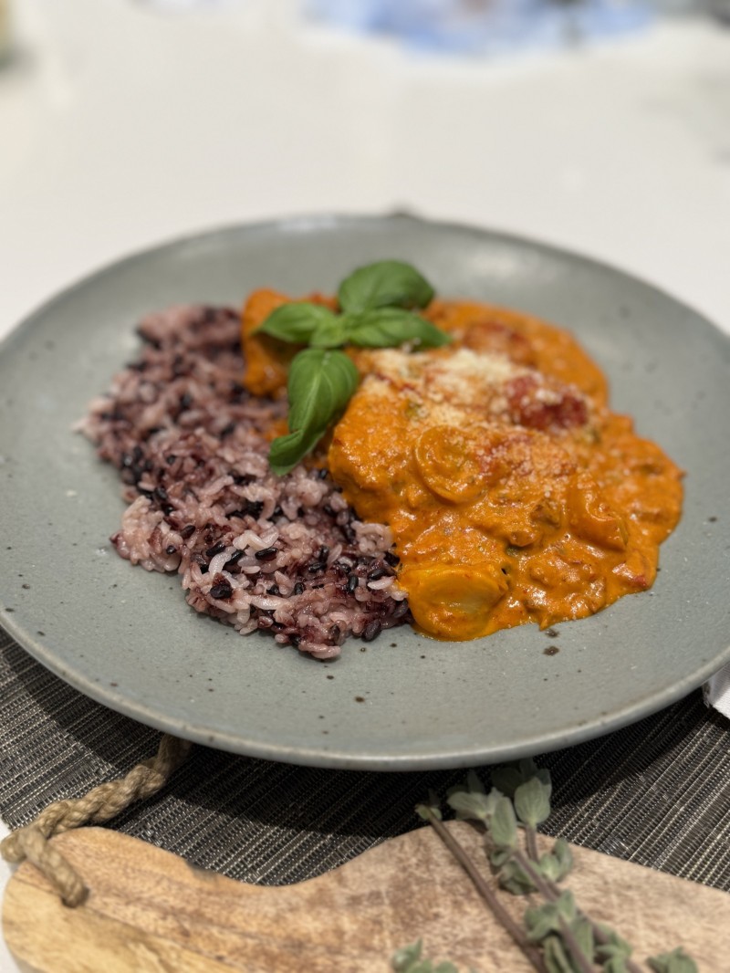 - Now make the sauce. Reduce the heat to medium-low and add garlic. Cook for 1–2 minutes until fragrant, and soften but not browned. Stir in tomato paste and gochujang, cooking for 2 minutes until the color deepens. Add the oregano and red pepper flakes, sauté for about 30 seconds. Increase heat to medium, pour in the chicken stock, and simmer until reduced by half. Stir in the fish sauce (or soy sauce), cream, Parmesan, sun-dried tomatoes, and cherry tomatoes. Simmer until slightly thickened. Season with salt and pepper to taste.